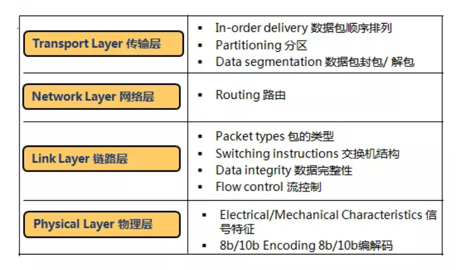 InfiniBand也是一种分层协议(类似TCP/IP协议),每层负责不同的功能,下层为上层服务,不同层次相互独立,每一层提供相应功能。InfiniBand协议可满足各种不同的需求,包括组播、分区、IP兼容性、流控制和速率控制等。