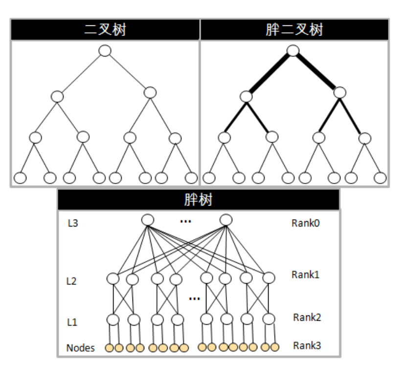 算法在一定程度上也决定了InfiniBand网络拓扑结构,尤其在高性能计算、大型集群系统,必须要考虑网络之间的拓扑结构,网络上行和下行链路阻塞情况也决定着整个网络性能。由于树形拓扑结构具备清晰、易构建和管理的有点,故而胖树网络拓扑结构常常被采用,以便能够发挥出InfiniBand网络优势,也通常应用在无阻塞或阻塞率很低的应用场景,所以我们下面我们重点讨论下。