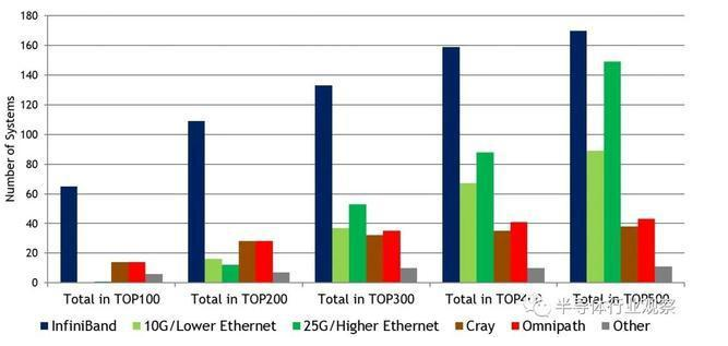大多数 Top100 系统和列表中的所有 Top10 系统都是我们所说的真正的超级计算机——这意味着它们将传统的 HPC 作为日常工作,尽管越来越多的机器在兼职做一些 AI。她是这些上层机器的互连分布情况: