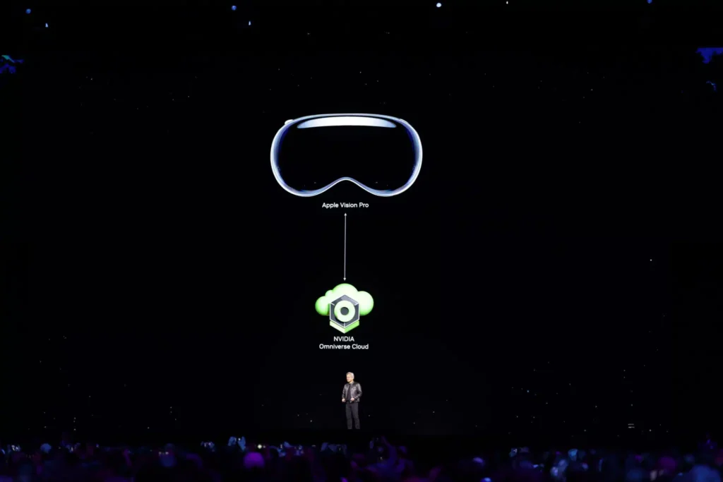 黄仁勋还宣布,NVIDIA 将把 Omniverse 引入 Apple Vision Pro 中,通过新的 Omniverse Cloud API,开发者可以将交互式工业数字孪生流式传输到 VR 头显中。