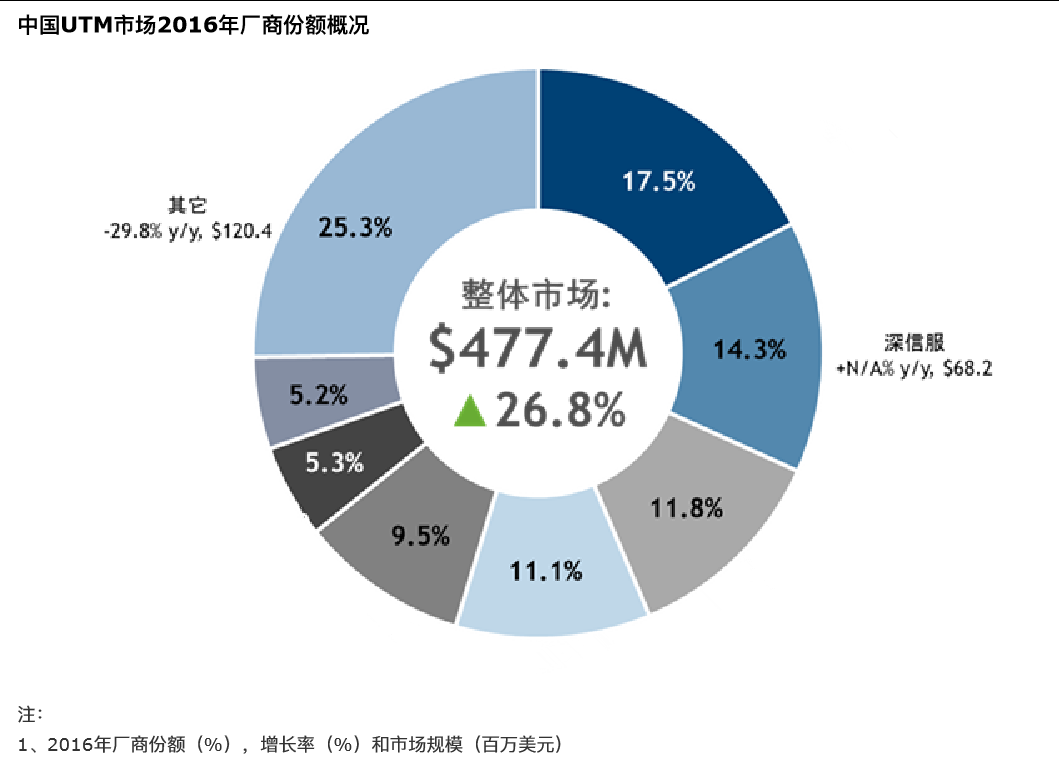 在IDC 发布的《中国统一威胁管理(UTM)市场份额,2016:怒放的下一代防火墙市场》报告中,2016年,整个UTM硬件市场的规模为US$ 477.4M,同比增长26.8%,保持高速增长态势。从市场份额来看,威翰德(Sangfor)凭借下一代防火墙单品类产品,以14%的市场份额排名第二。