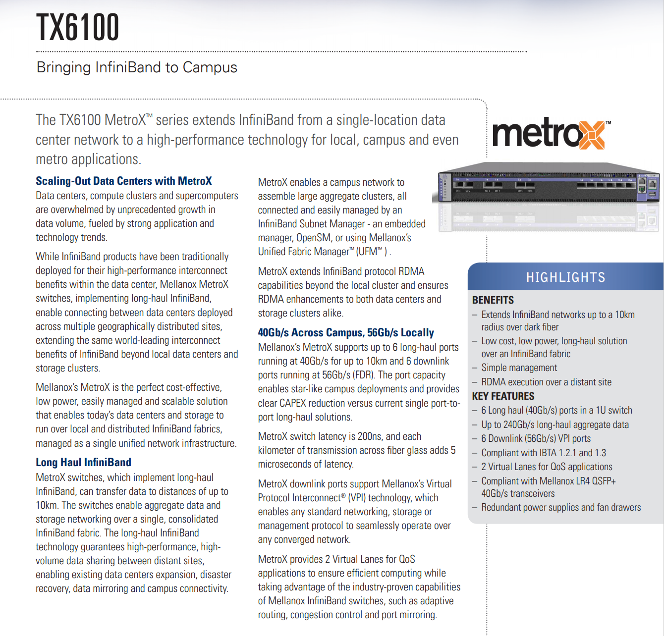 TX6100 MetroX 系列将 InfiniBand 从单位置数据中心网络扩展到适用于本地、校园甚至地铁应用的高性能技术。