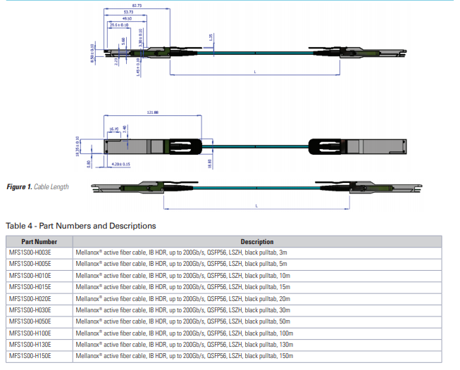 MFS1S00-HxxxE 具有标准 SFF-8665 符合要求的 QSFP56 端口,在电气方面面向主机系统。它包含四个多模式光纤(MMF)光收发器每端:MFS1S00-HxxxE 以高达 50Gb/s 的数据速率运行,为其光发射器和接收器提供每个通道可选择的重新调整,最高费率为 50Gbp/s。