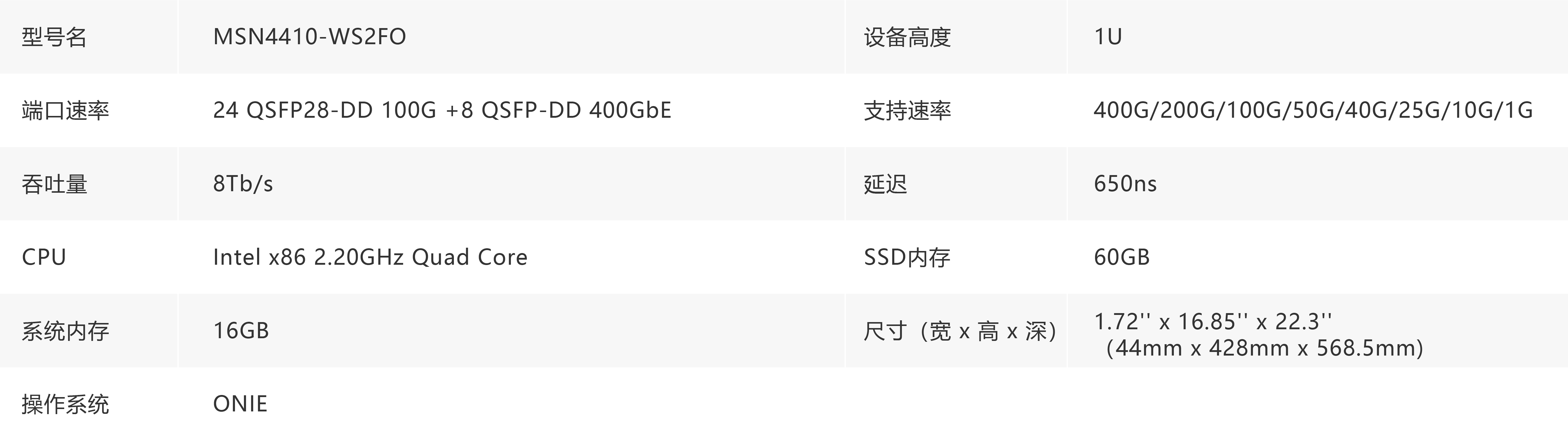 SN4410 是 48 端口 100GbE (24x QSFP28-DD) + 8x 400GbE (8x QSFP56-DD) 叶/脊交换机系统。 SN4410 非常适合将 100GbE 服务器和网络连接到 400GbE 基础设施。 SN4410 在密集的 1U 外形尺寸中具有里程碑式的 8.4Bpps 处理能力和 8.0Tb/s 吞吐量,提供 10/25/40/50/100/200/400GbE 组合的多种连接。